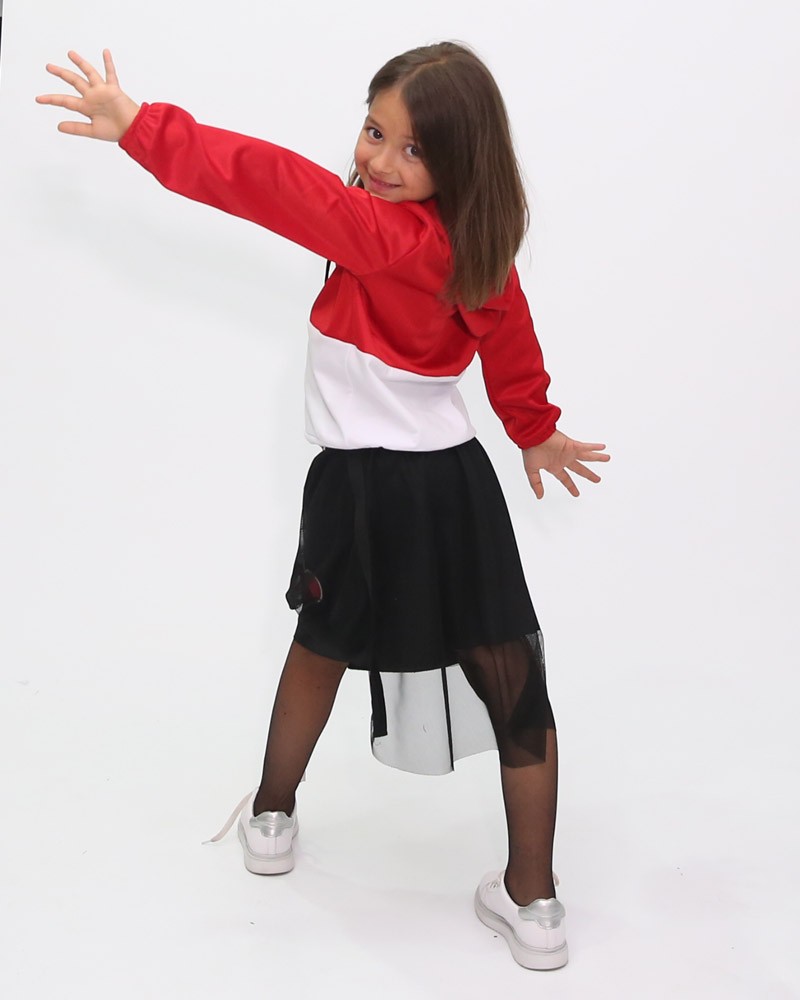 Un Trend di Stagione, che dona alle nostre clienti un look interessante e garantisce comfort e vestibilità. Realizzato in felpa acetato 100%poliestere con stampa gonfiata e balze in tulle con crochè nero laterale. Bustino liscio e cedevole con elastico colorato. Un Outfit esclusivamente made in Italy. Veste ragazze da 8 a 16 anni. Idea regalo. Si consiglia un lavaggio a mano. Subito a casa con massima sicurezza.