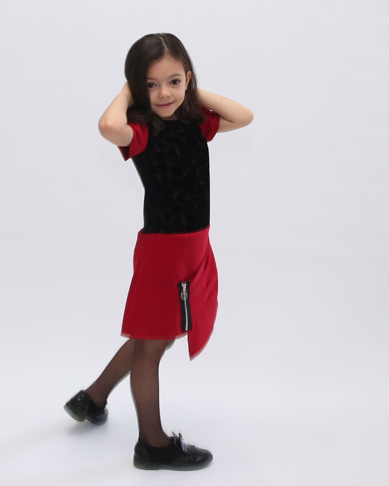 Il vestito Baby Enylò è stato creato in due tessuti, per cui il corpetto è fatto dalla parte avanti da un particolare tessuto floccato, chiamato Vestrella Burnout composto da 77% Ryan e 23% Nylon con trama in stelle, mentre le maniche con arricciatura in tessuto Bi-Stretch in colore rosso/india, composto da 90% Poliestere e 10% Elastam. La parte posteriore del bustino è realizzato in tessuto Bi-Stretch nero. La chiusura è fatta con lampo invisibile nera. La parte inferiore dell'indumento in colore rosso con lampo visibile e cursore a cerchio in Nichel che funge da accessorio.