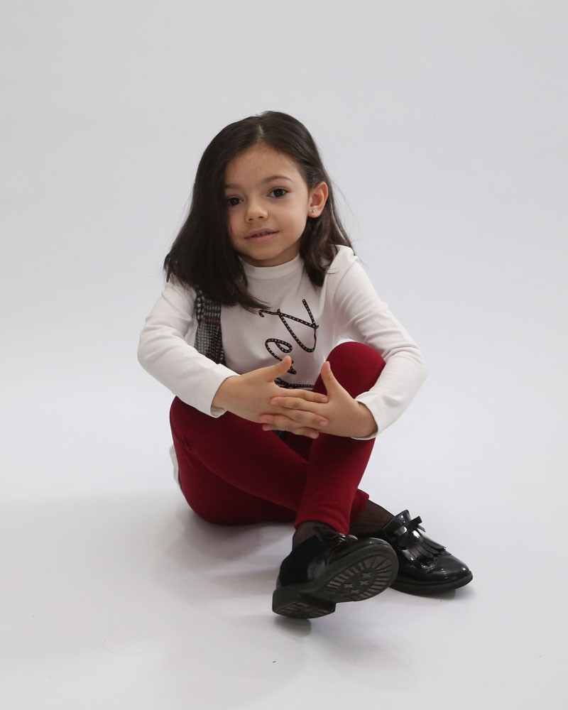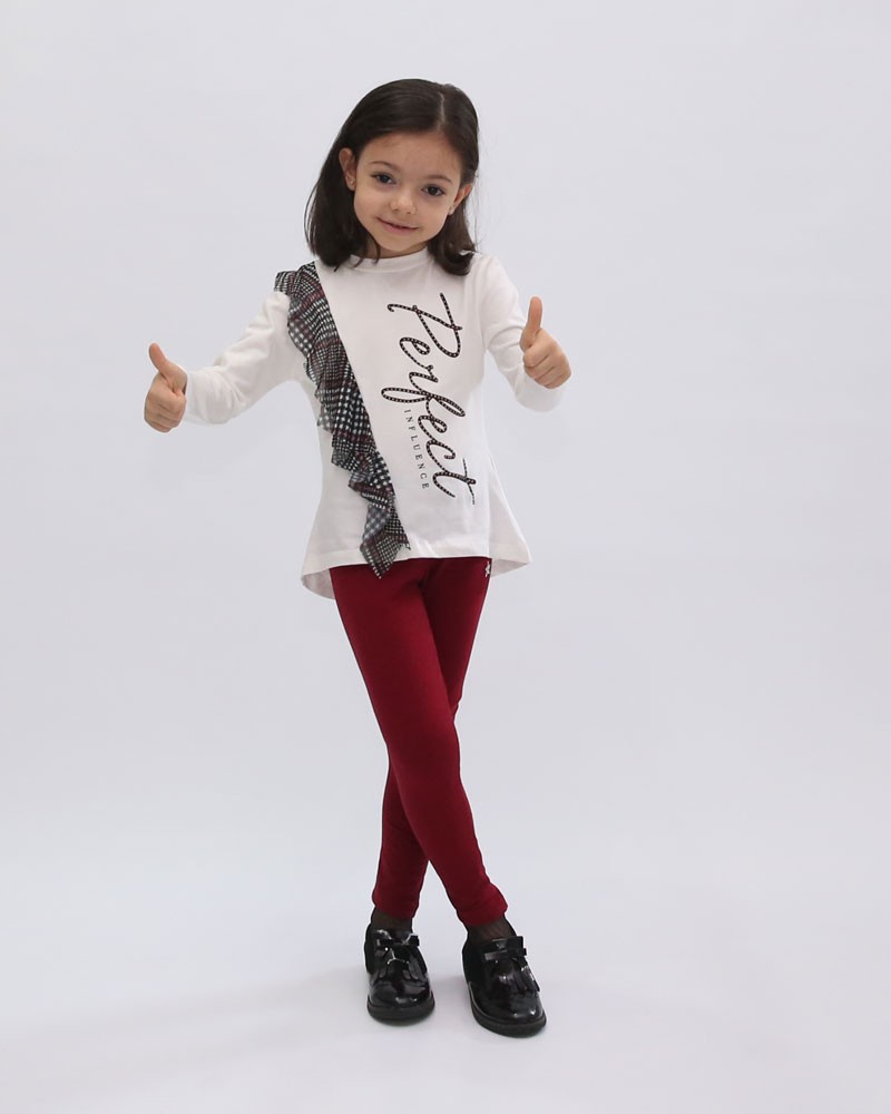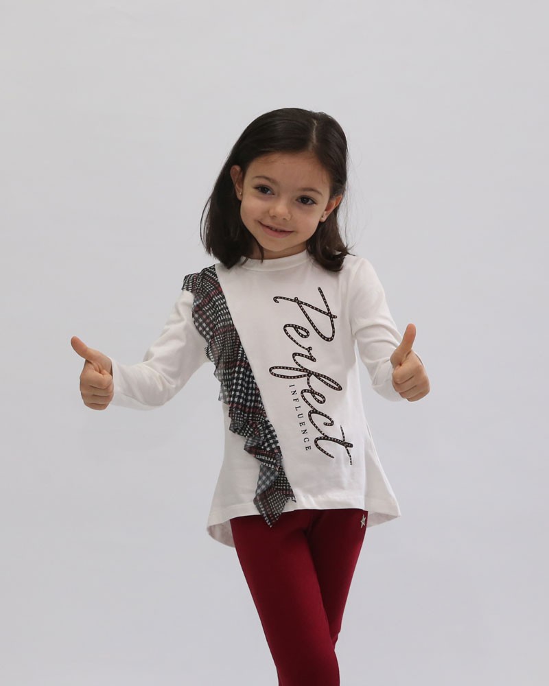 Maxi Maglia Baby Enylò a girocollo con applicazione in rouches di tessuto in rete elastica stampata scozzese. Il capo realizzato con bielastico felpato, composto da 94% Cotone e 6% Elastam, presenta una stampa personalizzata sul davanti e può essere indossata dalle nostre clienti più piccole dai 3/7 anni.
