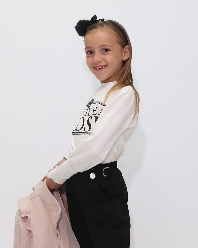 Maglia Ragazza Enylò adatta per qualsiasi look, calda e morbida al tatto, garantisce comfort e vestibilità. Un outfit Made in Italy, realizzato con tessuto bielastico in cotone garzato 95% Cotone e 5% Elastam, scollo rotondo a maniche lunghe, polsi con rouches e stampa nera "LA VIE EN ROSE", arricchita da Strass. Un Design a tinta unita, facile da abbinare. Veste ragazze da 8 a 14 anni. Si consiglia un lavaggio a mano. Subito a casa con massima sicurezza.