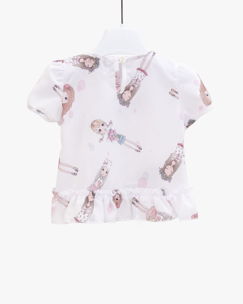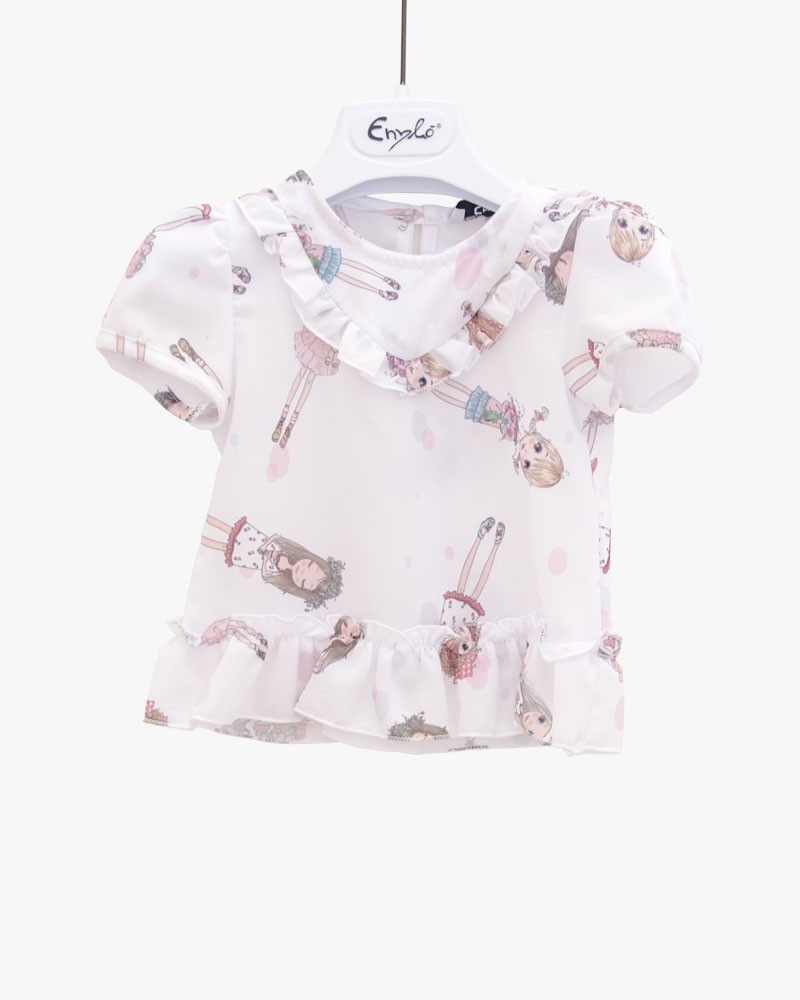 In tessuto zara stampato in fantasia bamboline, è a mezza manica, con rouches al collo e balze nella parte finale della camicia. Adatta per qualsiasi occasione, un outfit che fa moda! Abbinabile con i leggins basic Enylò in rosa.